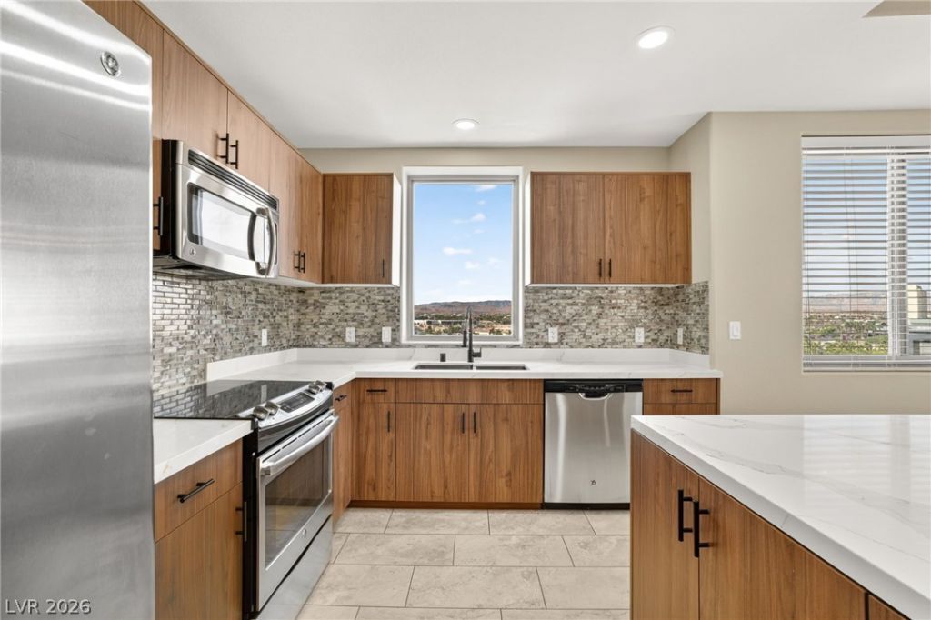 Indulge in a true lock-and-leave lifestyle where luxury meets effortless living. This sophisticated high-rise residence has 2 bedrooms - 3 bathrooms and is designed for those who value experiences over upkeep?offering the freedom to come and go while every detail is handled for you. Unwind in resort-style amenities including a sparkling pool and spa with cabanas and fire pit, fitness center, tennis courts, private theater and screening rooms, business center, clubhouse, and curated social events. Enjoy the ease of concierge service, 24-hour security, two assigned parking spaces, private storage, pet parks, and beautifully maintained grounds. Just moments from the Strip and the future Brightline West high-speed train, this is elevated, convenient living at its finest?perfect for a second home, weekend escape, or full-time luxury living.