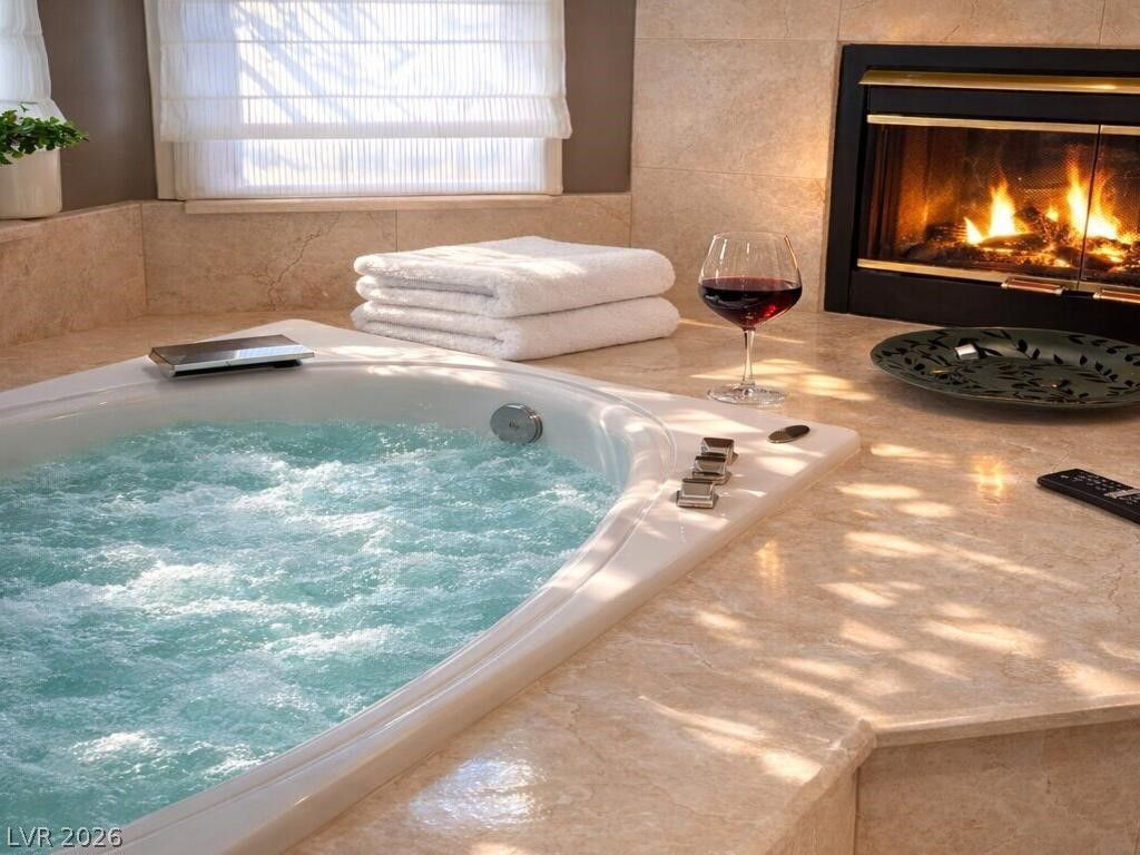 Luxury in Summerlin. The Belaire Estates sits in the heart of Summerlin behind its gated community. 5 BR 4.5 BA Mediterranean style home features vaulted ceilings, 3 Fireplaces, recently remodeled kitchen, newer LG Black stainless appliances, new A/C HVAC unit, new water heater and potential mother in law guest area or studio downstairs w/ private entrance. Gourmet kitchen, dual microwave convection oven, lots of storage areas, porcelain countertops and matching kitchen table included. One Brm and 3/4 bath downstairs. All other brms are updstairs offering maximum privacy. All rooms good size, huge closets, primary bath w/ jacuzzi tub, fireplace and flat screen TV. Home office and Gym. Expansive backyard, lagoon style heated pool, waterfall, BBQ grill, covered patio for entertaining. 3 car garage w/ Elec Car Charger. Closed Circuit security SMART Home.